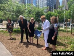“Anne iki yıl boyunca Hollanda’da saklanırken, saklandığı evden tek görebildiği ağacı günlüğünde anlatır. Bu ağaç ona umut ışığı olmuştu, bu yüzden, bugün biz de faşizm ve soykırımlara karşı durmamız gerektiğini unutmamak için ve Anne’in anısına bu ağacı dikiyoruz. Bu ağaç faşizme karşı olan mücadelenin sembolü olacaktır” diyerek ağacın önemini vurgulayan Douglas, Birleşmiş Milletler Genel Merkezi’nin bahçesine dikilen plaketin açılışı için Hollanda’nın BM Daimi Temsilcisi Karel J. G. van Oosterom’u davet etti.