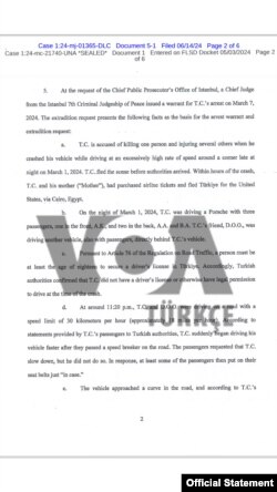ABD Adalet Bakanlığı’ndan VOA Türkçe ile paylaşılan, 3 Mayıs 2024 tarihli dilekçe ve yargıç imzalı yakalama kararında, ABD ve Türkiye hükümetleri arasında, 7 Haziran 1979’dan bu yana yürürlükte olan Suçluların İadesi Antlaşmasının olduğu hatırlatıldı.