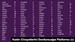 Türkiye’nin 64 ilinde kadın cinayeti meydana gelirken Amasya, Ardahan, Bayburt, Bilecik, Bingöl, Erzincan, Hakkari, Isparta, Muş, Niğde, Ordu, Rize, Sinop, Tokat, Trabzon, Tunceli, ve Yozgat’ta kadın cinayeti tespit edilemedi.