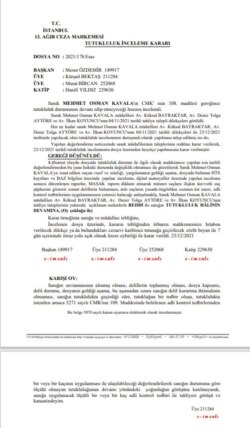 İstanbul 13. Ağır Ceza Mahkemesi, bugün verdiği ara kararda Anadolu Kültür kurucusu Osman Kavala hakkında tutukluluğunun devamı yönünde karar verdi.