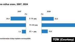 TÜİK sonuçları Türkiye nüfusunun yaşlanmaya hız kesmeden devam ettiğini de bir kez daha ortaya koydu. 2024’te çocuk yaş grubu olarak tanımlanan 0-14 yaş grubundaki nüfusun oranı, Adrese Dayalı Nüfus Kayıt Sistemi’nin devreye alındığı 2007 yılına kıyasla yüzde 26,4'ten yüzde 20,9'a gerilerken, 65 ve daha yukarı yaştaki nüfusun oranı ise yüzde 7,1'den yüzde 10,6'ya yükseldi.