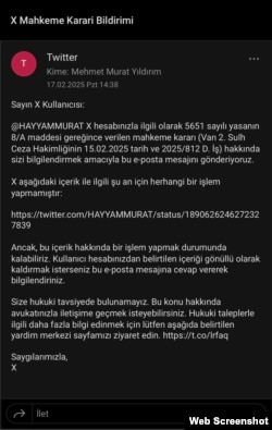 2025 yılının Şubat ayının başından bu yana, aralarında Voice of America (VOA) Kürtçe’nin de bulunduğu çok sayıda haber sitesi ve gazetecilere ait X hesaplarına erişim engeli getirildi. Van ve Adıyaman Sulh Ceza Hakimlikleri’nin kararlarıyla, VOA Kürtçe’nin dengemerika.com adresi dahil 21 URL’ye erişim Türkiye’den yasaklandı.