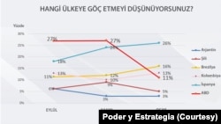 Öte yandan, yaklaşık 2,8 milyon Venezuelalı göçmene evsahipliği yapan Kolombiya'ya gitmek isteyenlerin oranı değişmeyerek yüzde 13'te kaldı.